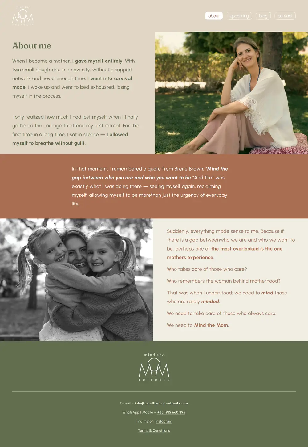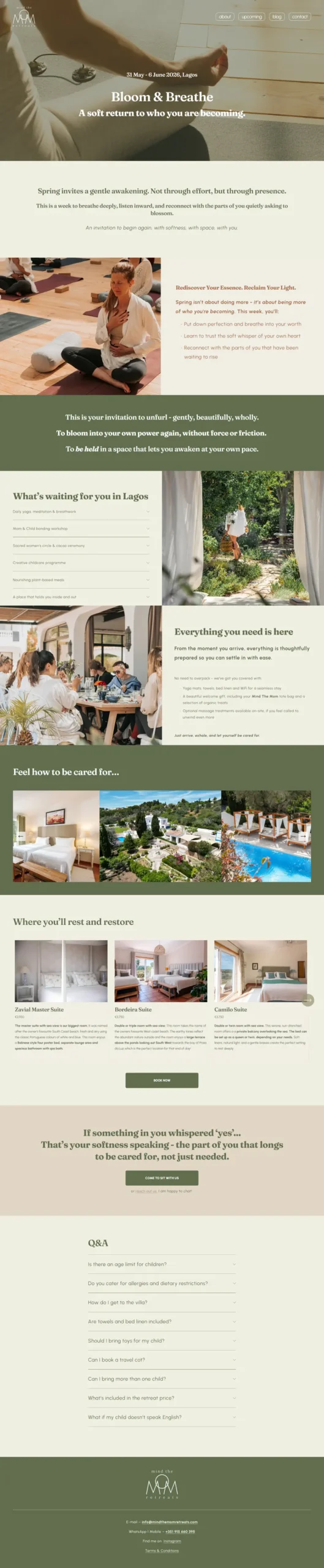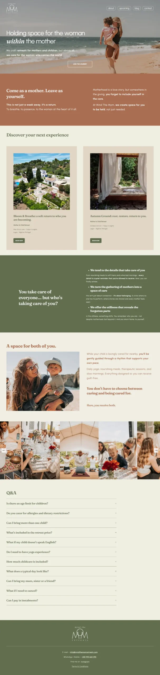 Redesenhamos o site da Mind the Mom Retreats para o alinhar com a sua nova identidade visual, refletindo toda a sua essência acolhedora e inspiradora. Partindo de uma estrutura já existente, otimizámos a experiência para criar uma navegação fácil e leve, que funciona perfeitamente em qualquer dispositivo.